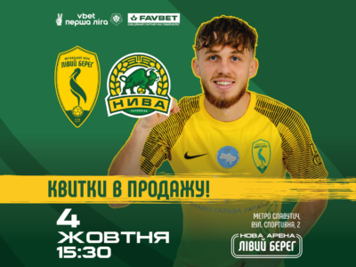 Лівий Берег – Нива: квитки у продажу! 03 Жов 2025 Цієї суботи Лівий Берег приймає тернопільську Ниву. Не сиди вдома – бери друзів, купуй квитки та приходь заряджати «лелек» на перемогу!